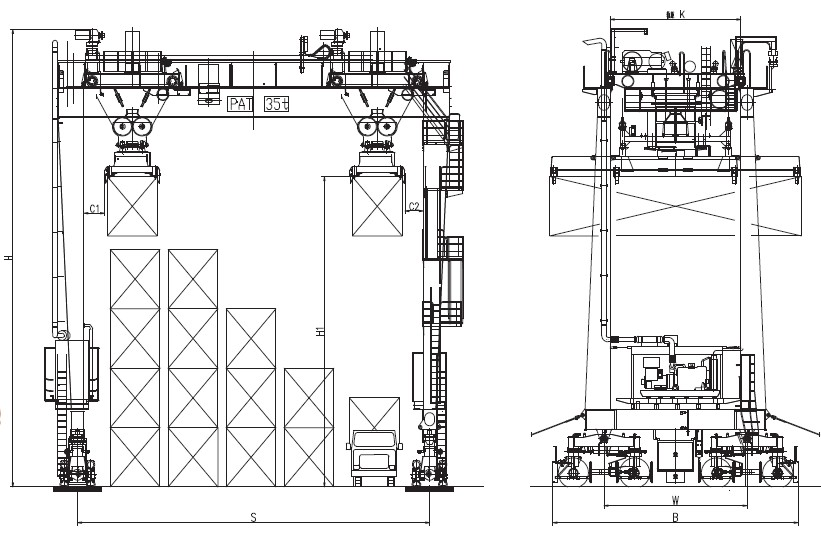 2、 采用專用集裝箱吊具,可起吊20、40、45標準集裝箱及液壓儲存罐。